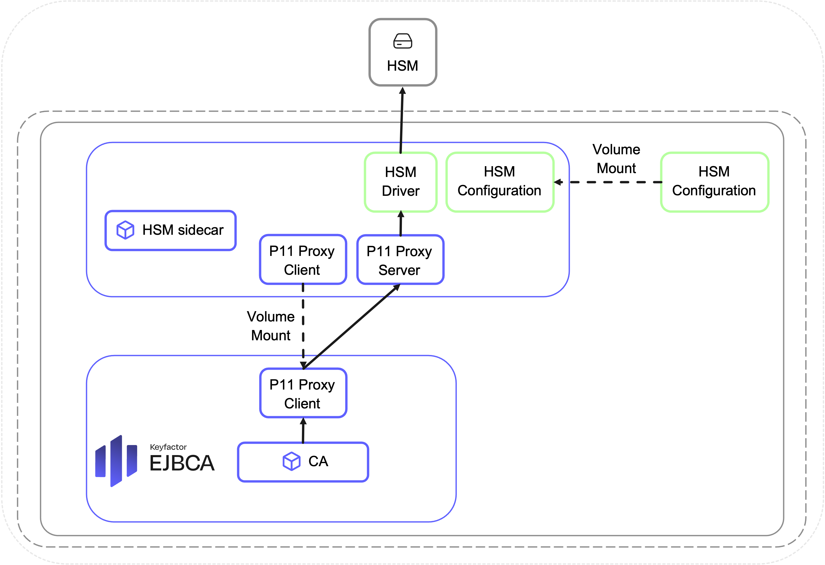 To integrate with HSMs that use the PKCS#11 interface, a separate sidecar container is required. This setup facilitates communication between the EJBCA/SignServer application container and the HSM exposing the PKCS#11 interface.