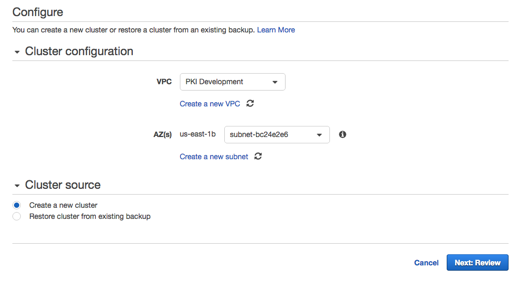 - In the Cluster configuration section, select the VPC and Subnet in the Availability Zone (AZ) of your EJBCA Enterprise Cloud Instance: