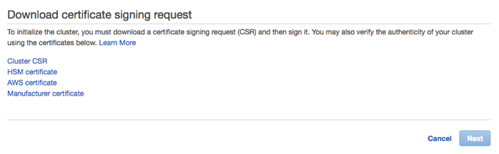 - Links appear to Download a certificate signing request (CSR) from the HSM Cluster to authenticate it.