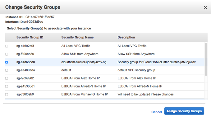 - You will see a new security group that was generated from the CloudHSM install process. Select it and click Assign Security Group.