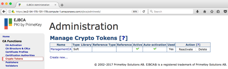 - Select Crypto Tokens under CA Functions, and then click Create new.