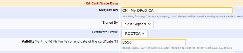 - Enter a Validity in days, for example 365d for one year validity of the CA.