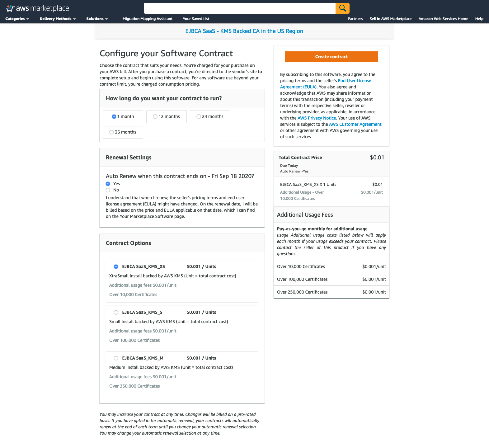 EJBCA SaaS is offered in the AWS Marketplace pricing model as a SaaS contract-based subscription. The contract options allow users to select the duration of the contract and the size of the PKI to be deployed. After subscribing to EJBCA SaaS on the AWS Marketplace, users are directed to the EJBCA SaaS portal to register, create an account and select EJBCA SaaS configuration details.