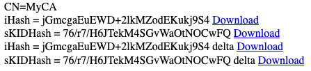The example above shows the iHash (the ASN1 encoded DN of the issuer in a certificate) and the sKIDHash (the ASN1 encoded hash of the CA subjectKeyIdentifier). Links to both the full CRL and the delta CRL are displayed and can be used as a CDP for CAs. This URL will hold the cached URL to the CRL for better performance. For more information, refer to the EJBCA Documentation on CRL Distribution Points.
