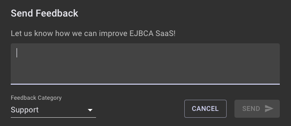 Please let us know how we can improve EJBCA SaaS. Whether it is something not behaving as expected, or a feature request, please let us know. To send feedback, click the Feedback button at the bottom right of the portal page. The feedback category should be aware of the current page, but an alternate page can also be selected from the Feedback Category list.