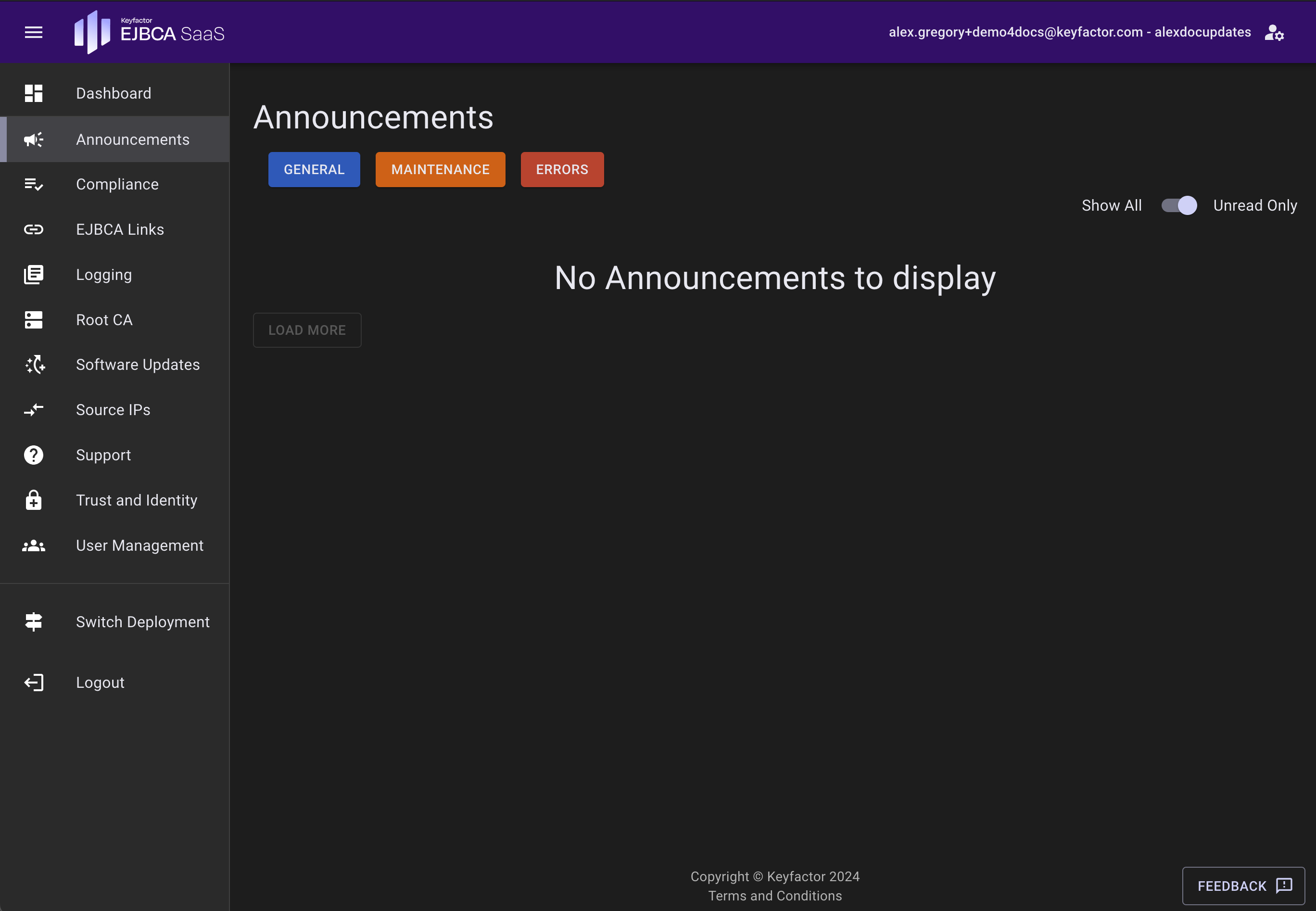 The Announcements page provides access to any announcements that the Keyfactor team has deemed necessary for you to know. This could be for any planned maintenance, outages, or upgrades made available. Marking the announcement as read will do this only for the current logged in user.