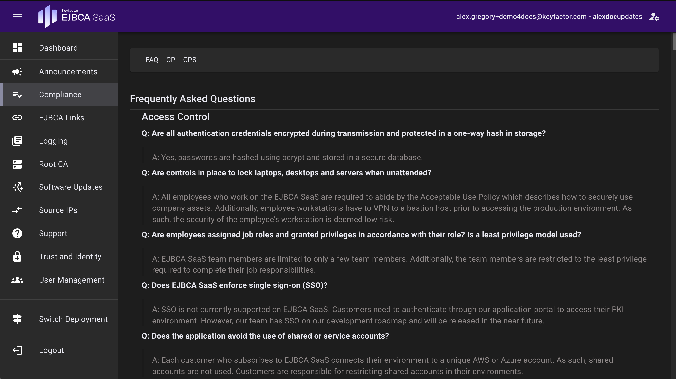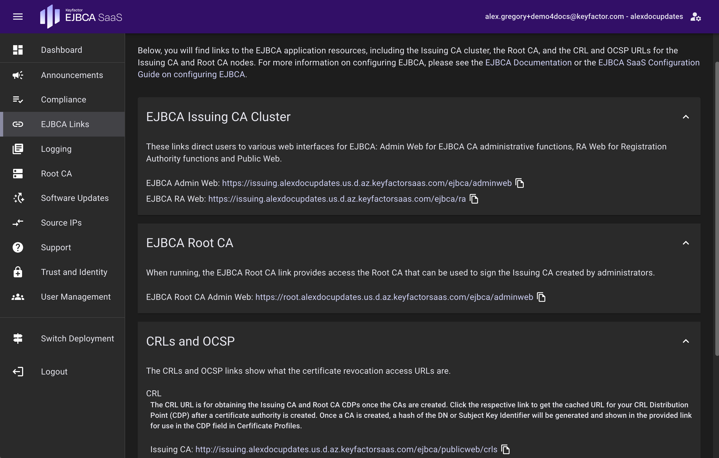 The EJBCA SaaS portal allows navigation of the EJBCA SaaS application and getting information regarding the EJBCA SaaS installation.