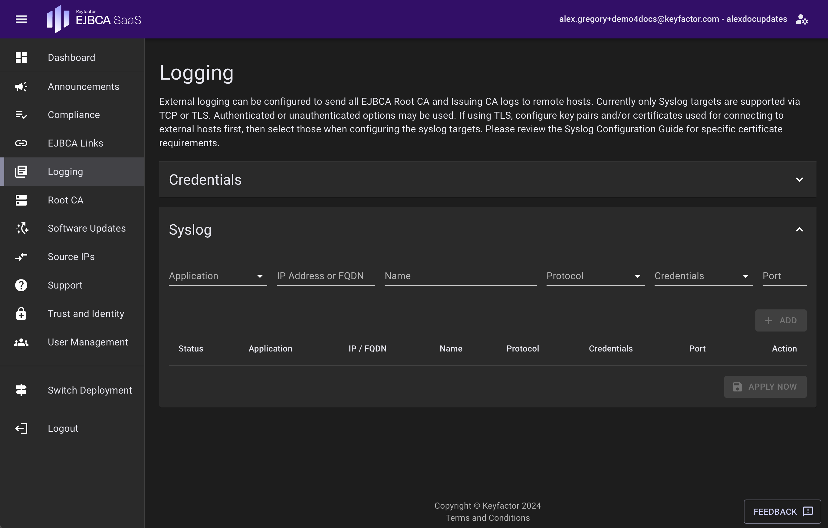 The Logging page allows users to configure external syslog destinations for getting the EJBCA and Apache logs from the Root and Issuing CA deployments. External logging can be beneficial when troubleshooting things like certificate enrollments.