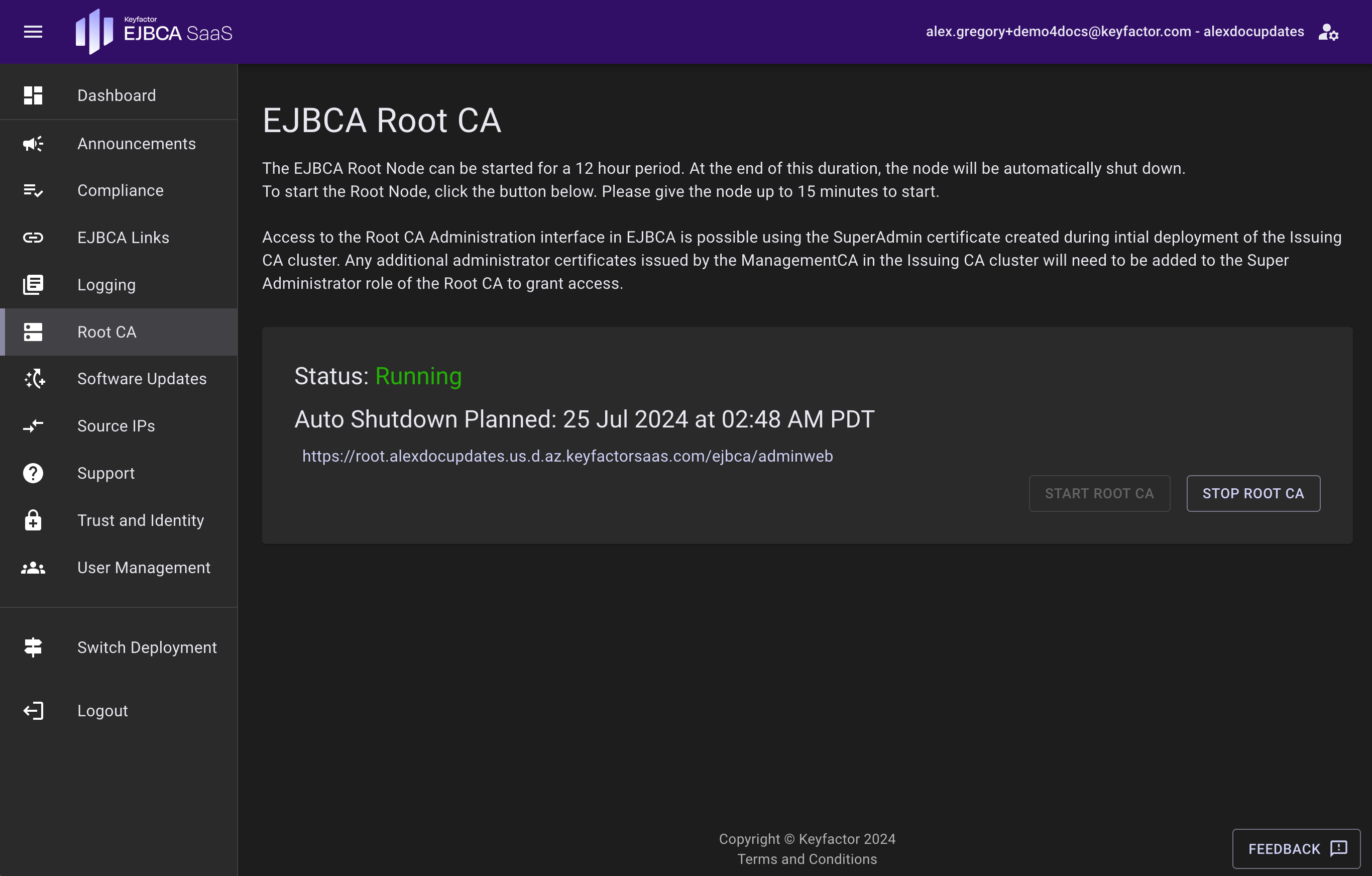 When running, the status will display when the 12-hour automatic shutdown of the Root CA will occur as well as a link to access the Root CA. The Superadmin credential issued from the ManagmentCA on the issuing CA cluster is used to access the Root CA Administrative interface. To change who can access the Root CA, navigate to the Root CA Admin Web and configure the Super Administrator Role as needed. For more information, refer to the EJBCA Documentation on EJBCA Roles and Access Rules. The Root CA is provisioned in a running state for the initial deployment and will shut itself down within 12 hours after the initial launch.