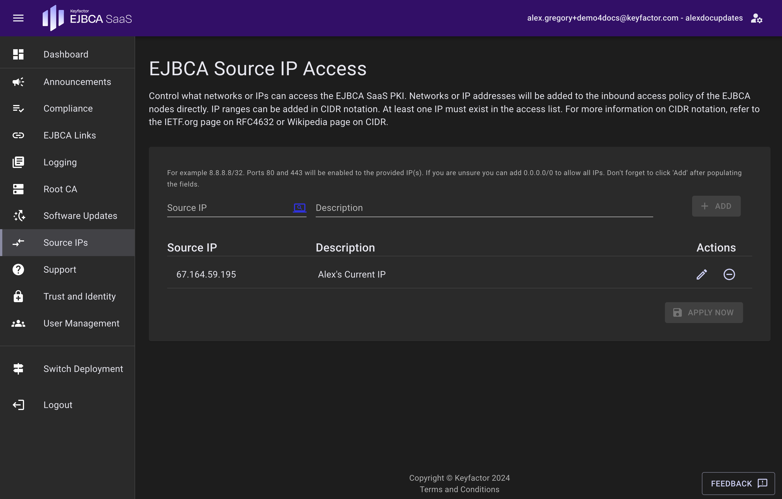 The Source IPs page allows control over what IPs can access the EJBCA Clusters. IP addresses here will be added to the inbound access to the EJBCA Clusters directly, and need to be added in the CIDR notation. For more information on CIDR notation, refer to the IETF.org page on RFC4632 or Wikipedia page on CIDR. This page will be disabled during the provisioning process.