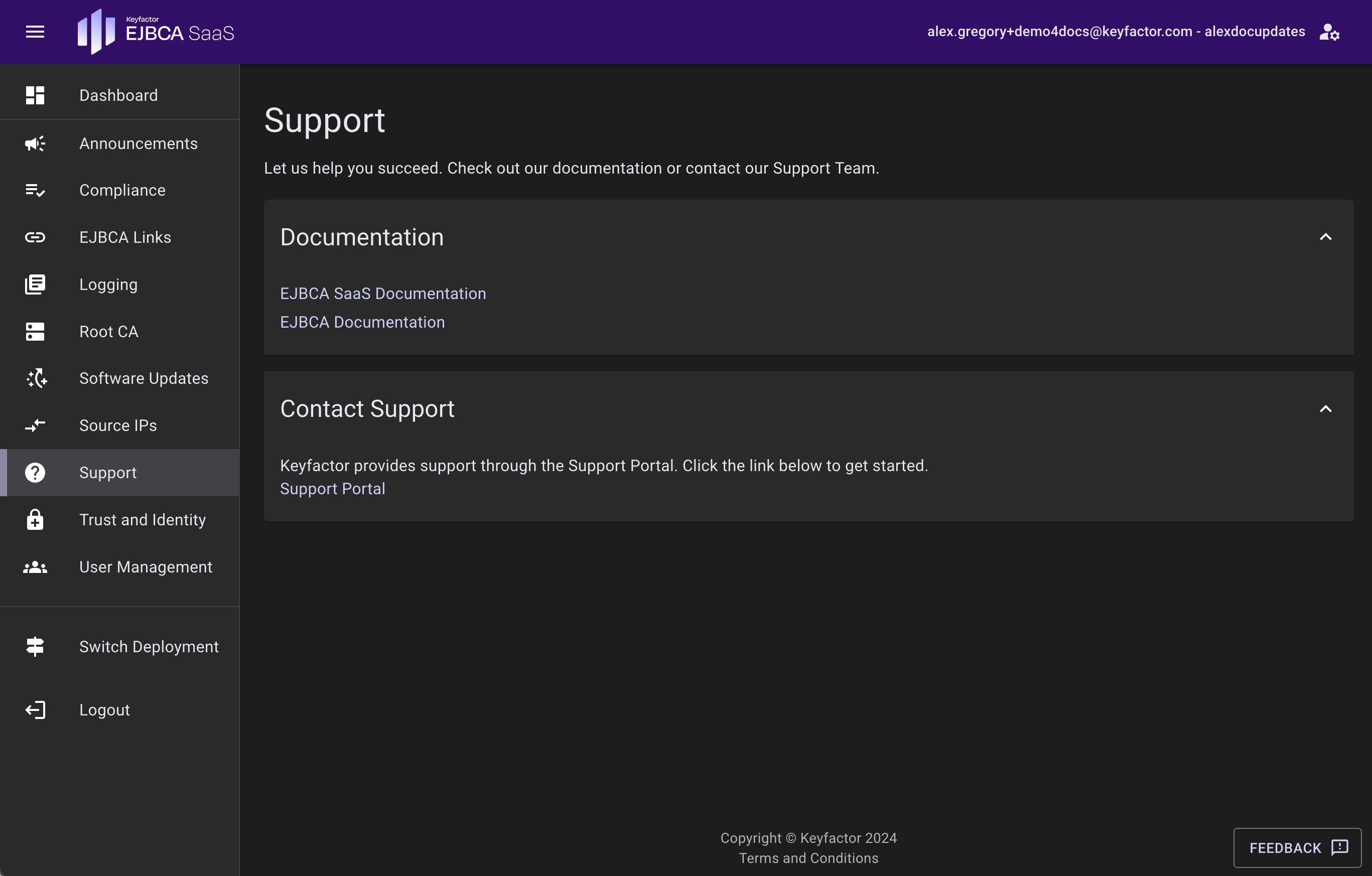 The Support page provides resources for users to gain help while using EJBCA SaaS.