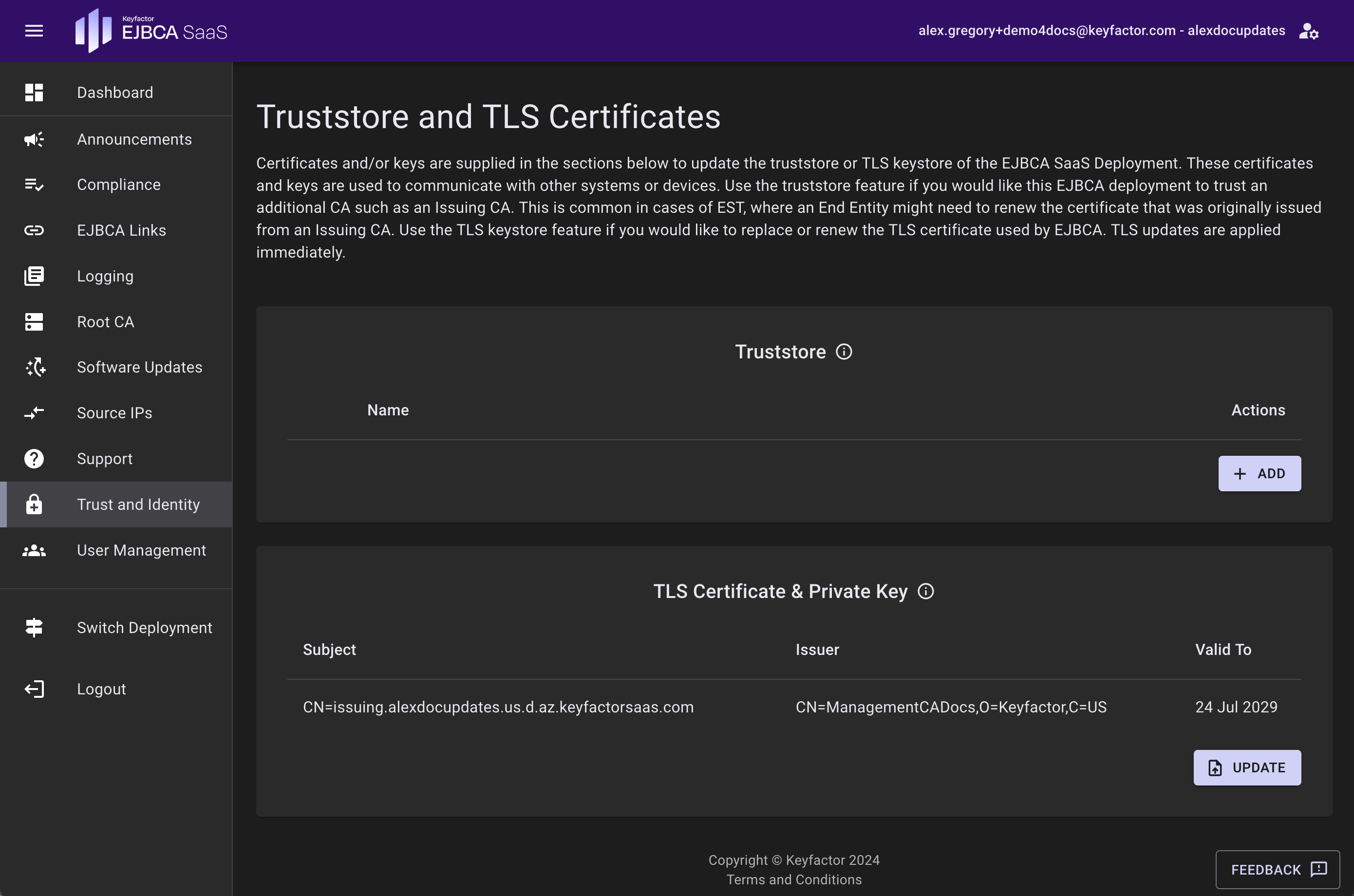 Certificates and/or keys are supplied here to update the truststore or keystore of the EJBCA SaaS Deployment. These certificates and keys are used to communicate with other systems or devices. Use the truststore feature if you would like this EJBCA deployment to trust an additional CA such as an Issuing CA. This is common in cases of EST, where an End Entity might need to renew the certificate that was originally issued from an Issuing CA. Use the TLS keystore feature if you would like to replace or renew the TLS certificate used by EJBCA. TLS updates are applied immediately.