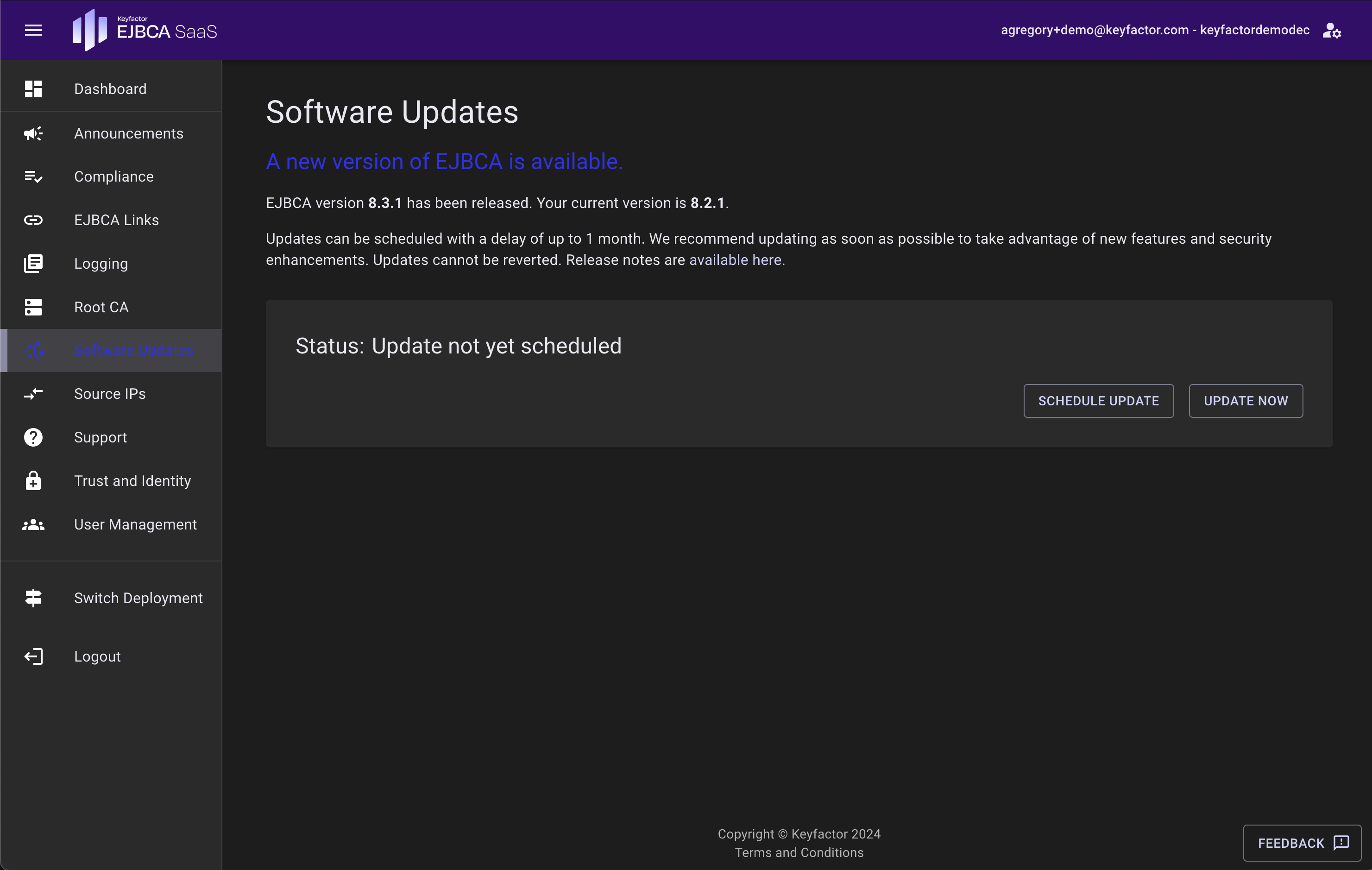 Any available upgrades to the EJBCA Software will be listed here. For more information on applying and scheduling upgrades to EJBCA, see EJBCA Upgrades.