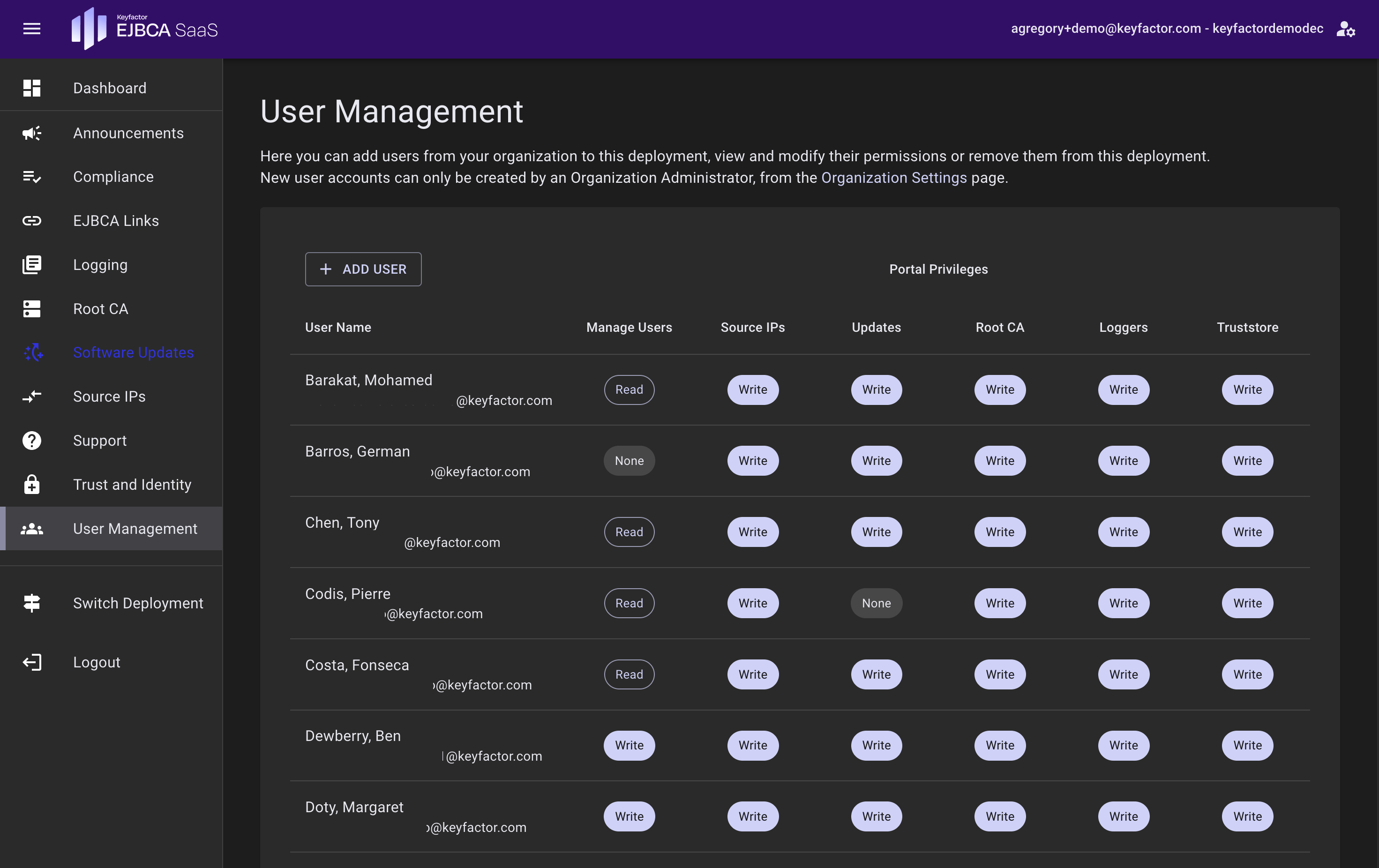 The User Management page allows for the management of users that have access to and can perform actions in the EJBCA SaaS Portal. Permissions can be granted to view, edit or restrict access to the Source IP, Root, and Logging pages. Users will appear here only after being added at the Organization level.