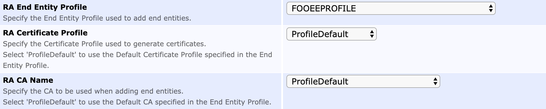 RA CA Name | ProfileDefault or the name of the CA to be used when creating End Entities and certificates for the substations |