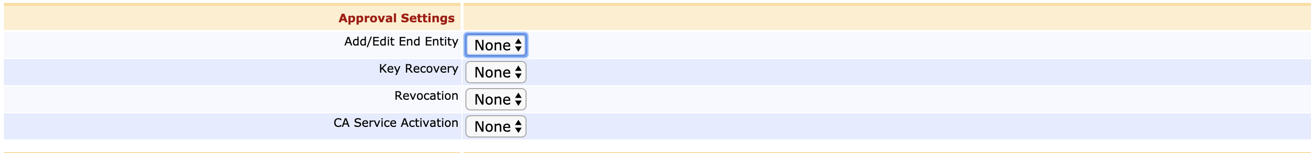 | CA Service Activation | Enabling approvals for this action means that in order to change a CA from offline to online, approvals from other administrators are required. |