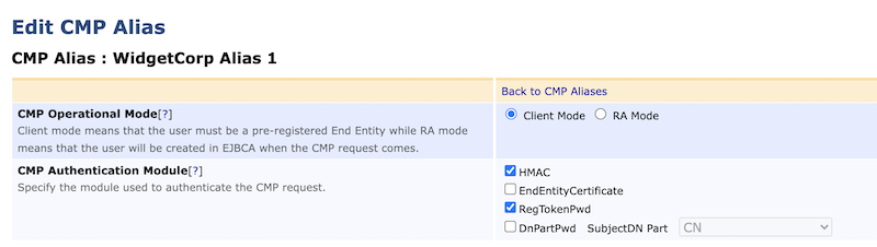 RA Mode | RA Mode instead assumes that the CMP client is a trusted entity and thus allows it to enroll end entities in the same action as submitting the keys for signature. In RA mode, EJBCA supports several CAs and profiles based on the use of configuration alias specified in the URL used (see RA Mode for CMP). |