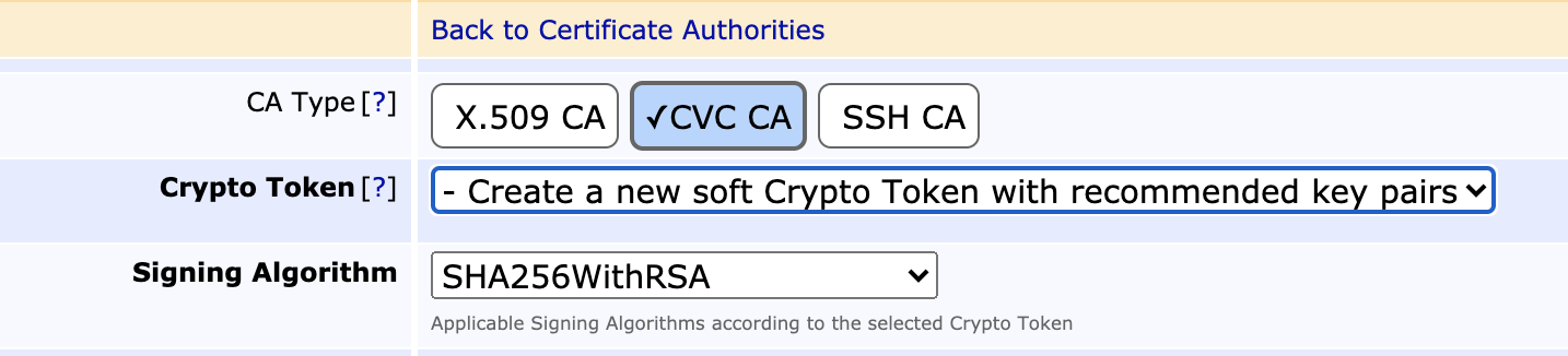 - On the Create CA page, select CVC as CA Type and choose the Crypto Token and Signing Algorithm.