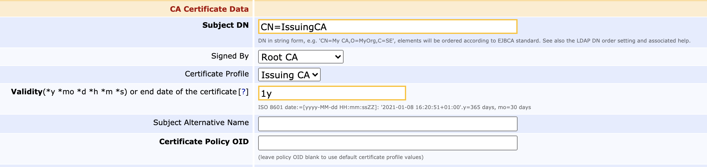 This page describes the workflow for creating an X509 Issuing CA, signed by a Root on the same node.