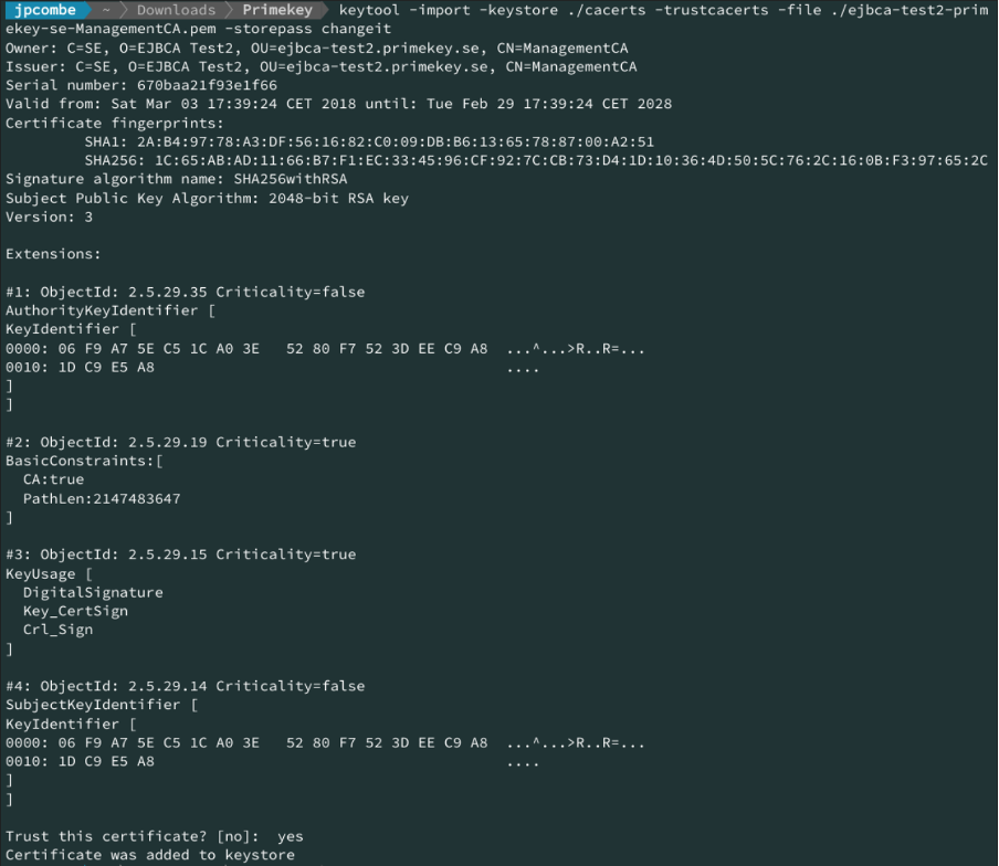 If keytool was not run on the server itself, copy the cacerts file back to the Google Cloud Certificate Connector server. Default location: C:\Program Files\Google Cloud Certificate Connector\rt\lib\security.