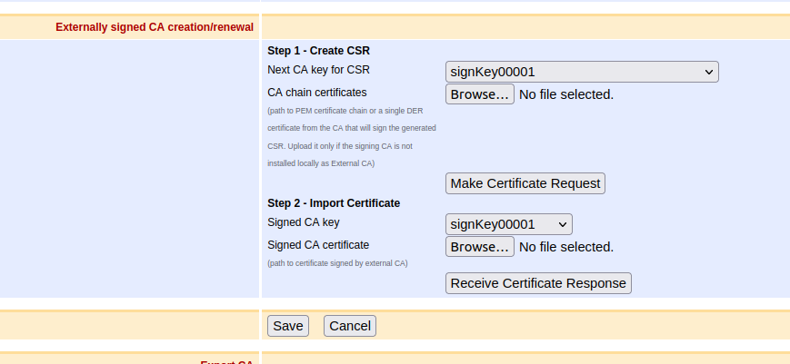 - Enrollment Authority Creation: EJBCA allows for the creation of an EA. However, the EA certificate must be signed by an external Root CA and this is done off-band. During the creation of the EA, a printable signed CSR is generated and made available as an OER encoded binary file to be downloaded.