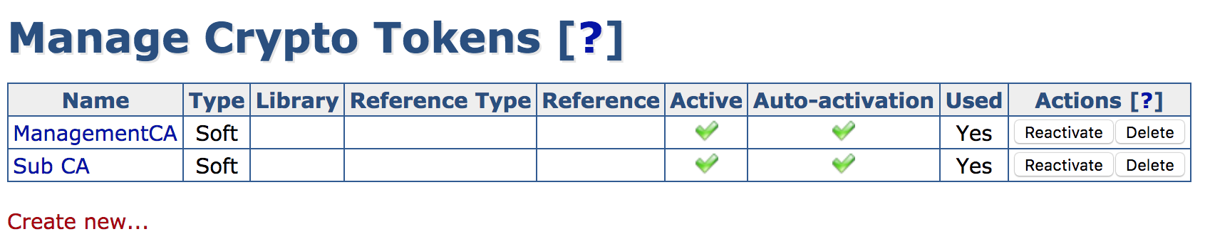 To create a crypto token, select the Crypto Tokens menu option to display the Manage Crypto Tokens page, and click Create new at the bottom of the page.