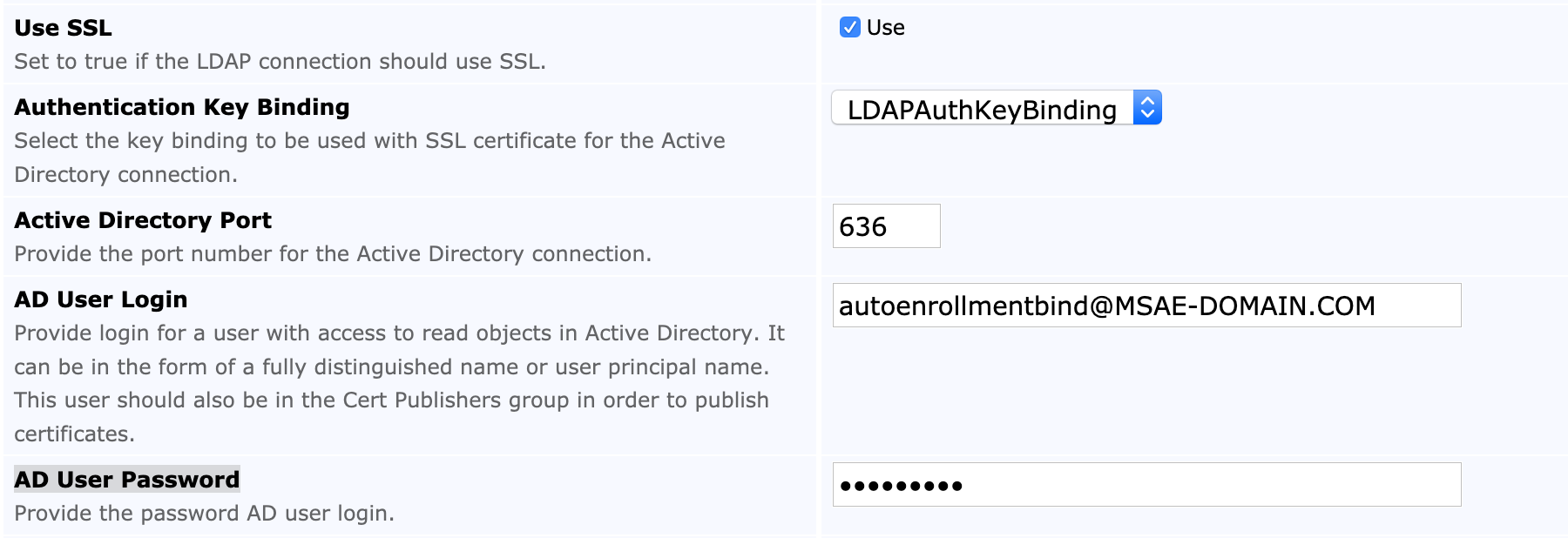 The following fields are set for the Active Directory (AD) connection. Note that SSL can optionally be used for the EJBCA instance's connection to the LDAP server.