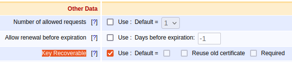 For more information, see EJBCA Configuration.Enable Key Recoverable in the end entity profiles used in the auto-enrollment alias configuration.