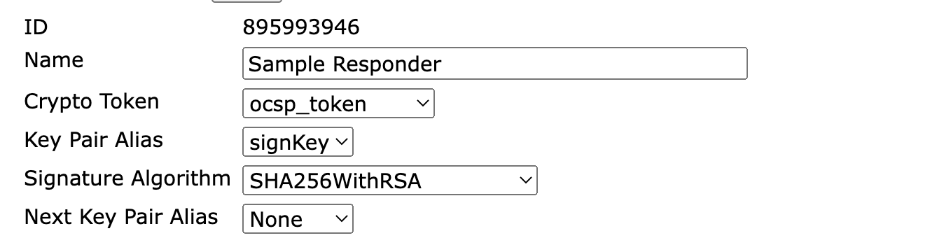 Responder ID Type for CAs | As defined in RFC6960 4.2.1, the responder ID type can be set as keyhash or name. For individual OCSP responders, this is configured per responder, but for CAs acting as their own responder, this is chosen globally here. |