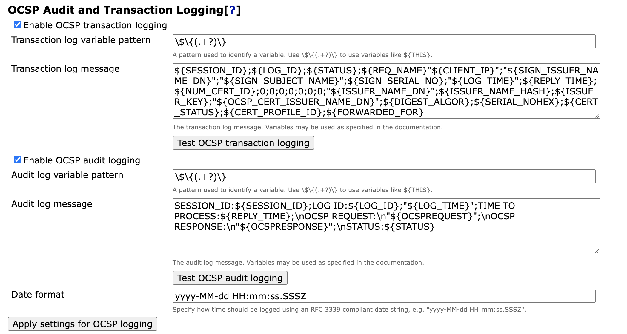 The log messages written to the OCSP transaction log and OCSP audit log can be customized using variables.