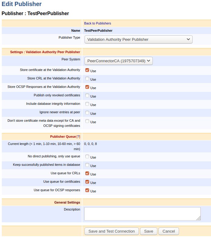 Like the Validation Authority Publisher, the Validation Authority Peer Publisher publishes issued certificates from an EJBCA CA to a VA, but over TLS using EJBCA Peer Systems. For more information about the publishers, see Validation Authority Peer Publisher and the Validation Authority Publisher.