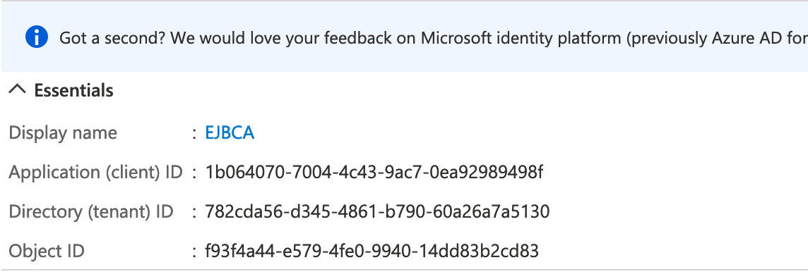 Azure AD assigns a unique application (client) ID to EJBCA and the Azure portal displays an EJBCA Overview page.