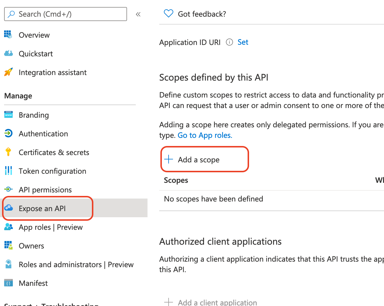 In the left-hand navigation pane, select Expose an API, and then click Add a scope.