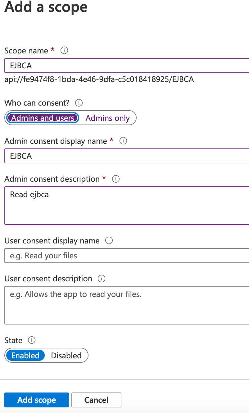 This shows that the Scope is api://fe9474f8-1bda-4e46-9dfa-c5c018418925/EJBCA