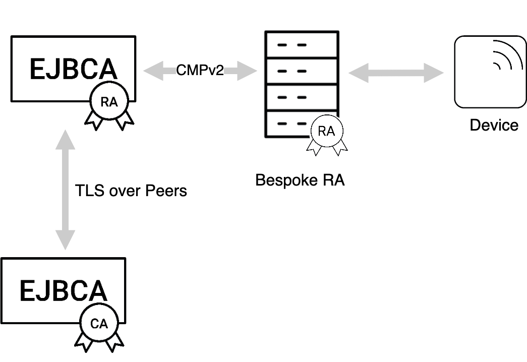 Additionally, there is an option to use EJBCA in RA mode, for indirect communication between EJBCA and the device via a third entity acting as an RA. In this case, the RA has a corresponding end entity in EJBCA and is given the necessary privileges to process CMP requests on behalf of the device.
