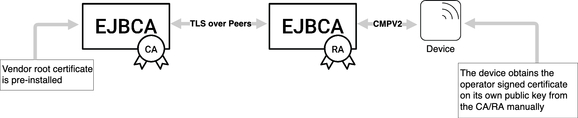 In the case of direct contact between EJBCA and the device, EJBCA operates in client mode. Each device has a corresponding end entity in EJBCA. The initial enrollment request/certification request is sent by the device to EJBCA as a CMP request signed by the key provided to the device by the vendor. The vendor issued certificate is attached to the request in the extraCerts field. EJBCA will authenticate the request by checking that the certificate in extraCerts was issued by the vendor CA (an external CA in EJBCA). If the authentication succeeds, EJBCA will issue a certificate for the device and includes it in the CMP response message.