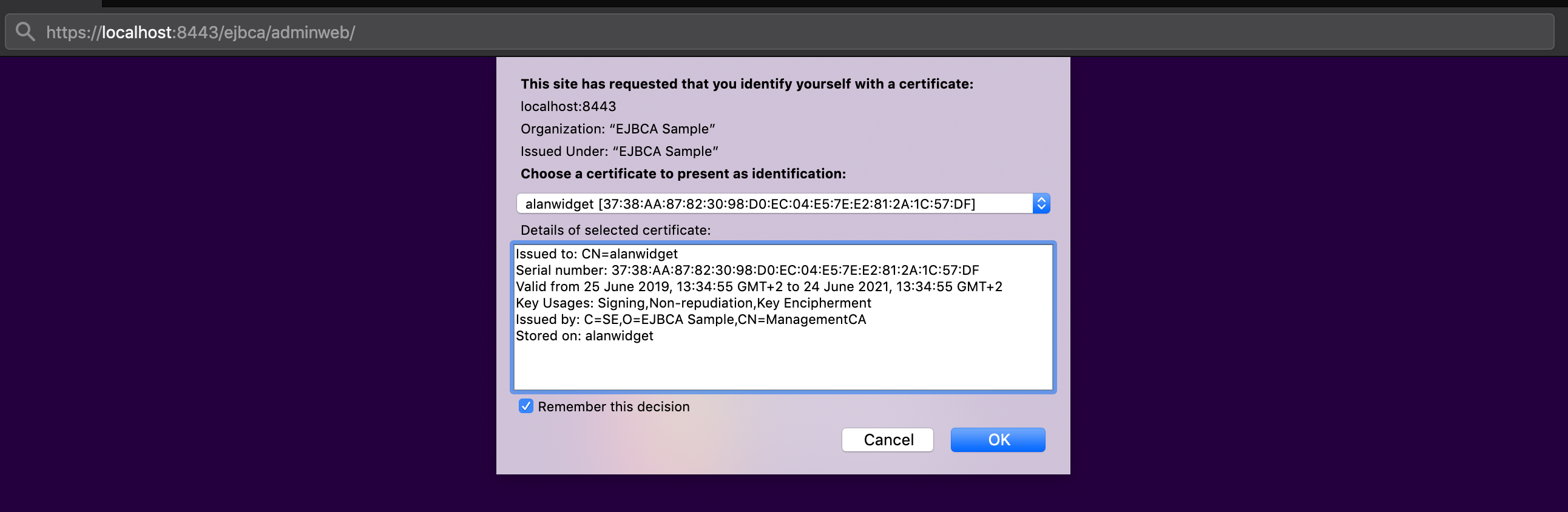 CODEmodutil -dbdir sql:$HOME/.pki/nssdb/ -list- Open EJBCA Admin UI in Chrome and enter your PIN when prompted.
