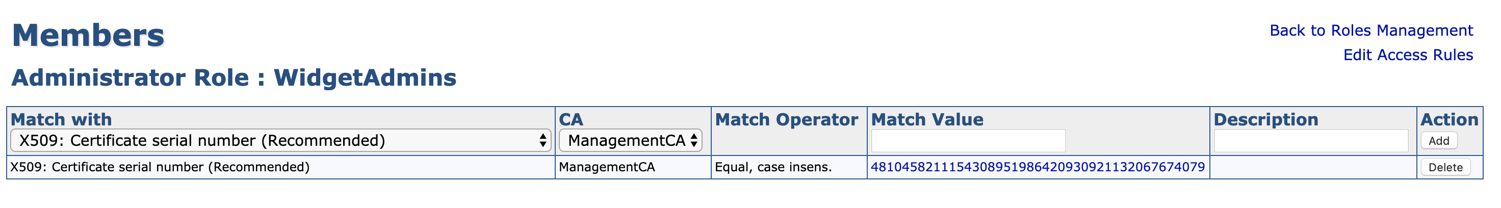 - To add the administrator to an existing role, click Members, select the appropriate CA and enter information identifying the certificate, preferably the serial number.