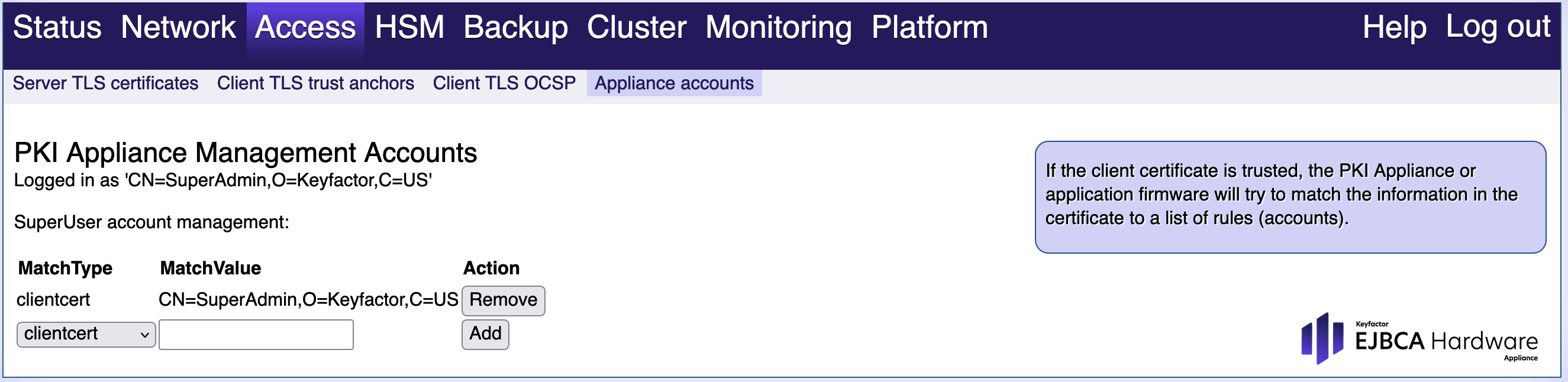 You can configure different trusted certificates (trust anchors) for each network interface. If you want to use client TLS certificates from an external CA, you need to replace the trusted certificate. To avoid locking yourself out of the Hardware Appliance, first add the appropriate matching rules in the sub tab Access > Appliance accounts, so that you can reconnect and continue to administer the Hardware Appliance after the trusted certificate is replaced.