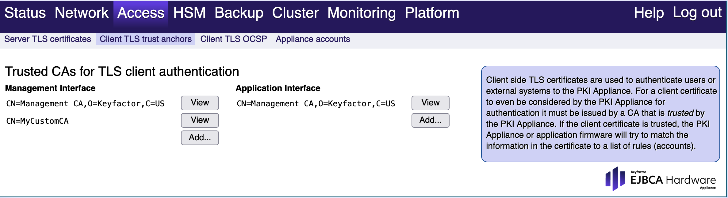 Switch the tab and go to Client TLS trust anchors. The section Trusted CAs for TLS client authentication is divided in two columns.