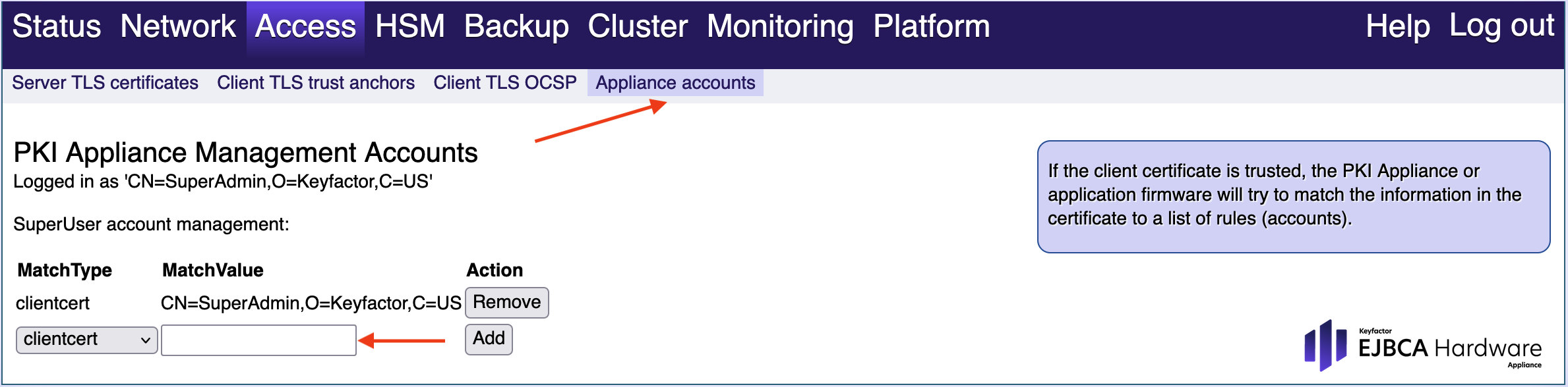 In the section PKI Appliance Management Accounts, select clientcert, provide the following SubjectDN and click Add.