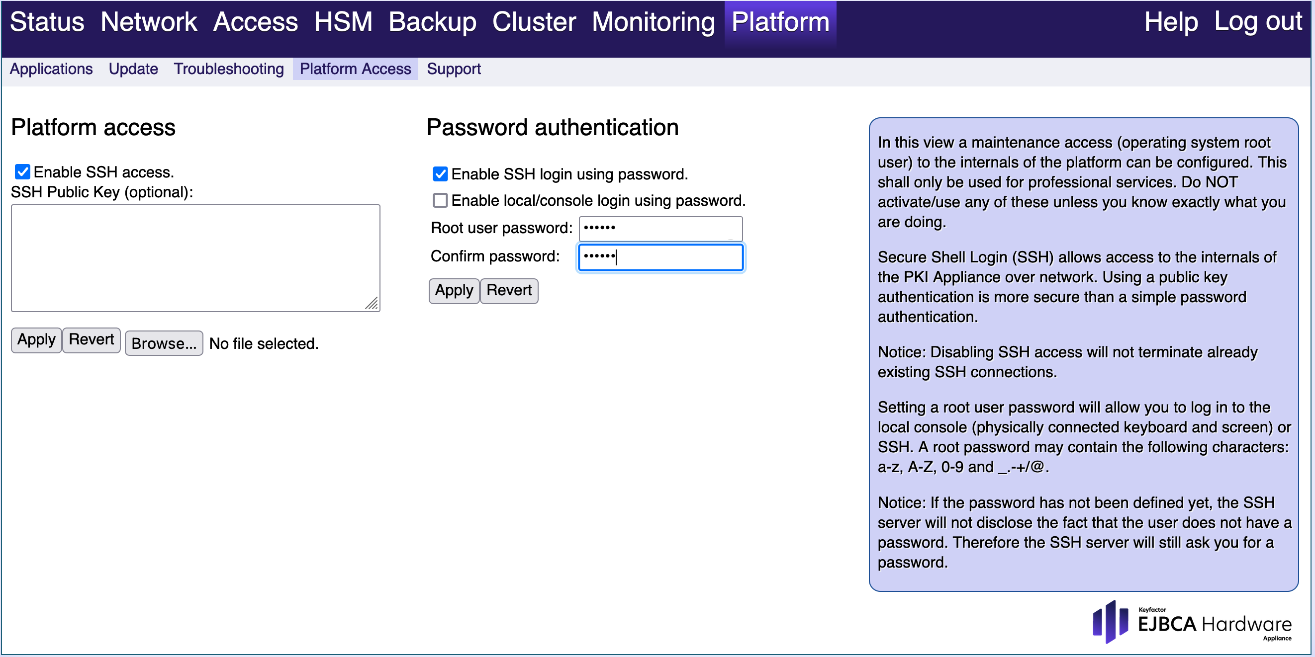 - Go to the Appliance WebConf, click Platform > Platform access and enable SSH.