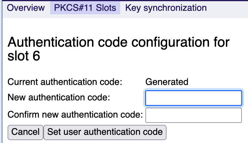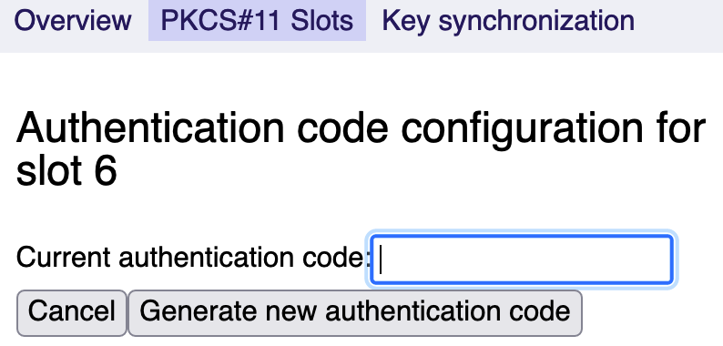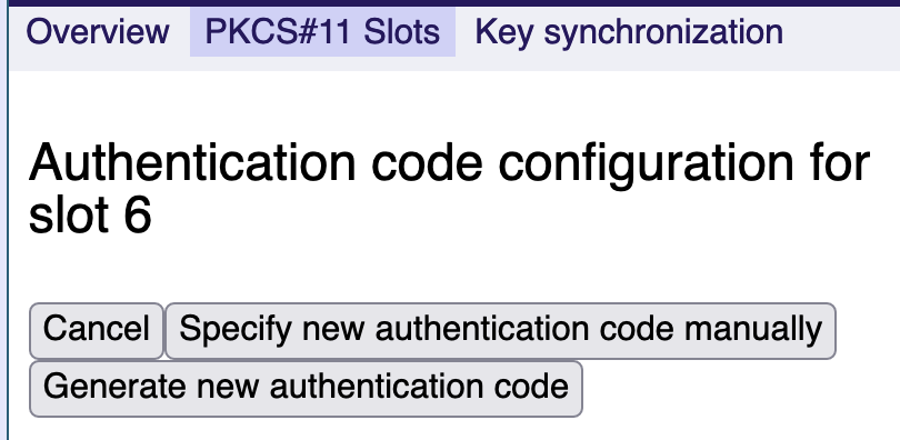 You can switch between automatically generated or manually specified authentication codes. By default, all slots are configured to be used with automatically generated authentication codes. Those are stored in EJBCA and have auto-activation enabled.