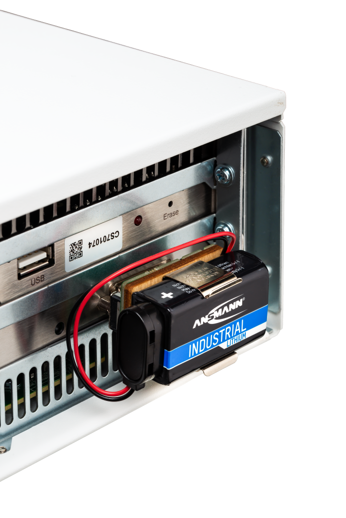 The external battery adapter has the task to support the power supply of the HSM. The HSM always requires power, even when the Hardware Appliance has not been put into operation or is not supplied with power. To prevent the HSM from being fully discharged and thus placed in maintenance mode, use the external battery adapter to buffer the internal HSM battery and extend its lifetime when the Hardware Appliance is powered off. This is useful, for example, when a Hardware Appliance is operated as an offline (root) CA.