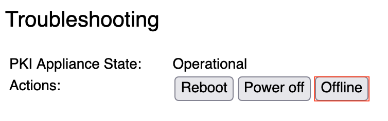 You can use the Offline function in the WebConf page Platform > Troubleshooting to manually activate the maintenance mode for the Hardware Appliance. In contrast to the automatic Maintenance state, the Offline state is not based on any apparent problem/cause. You can use this function to disable customer access to EJBCA/SignServer without completely shutting down the Hardware Appliance. Customers will then see the Notification page that is described below.