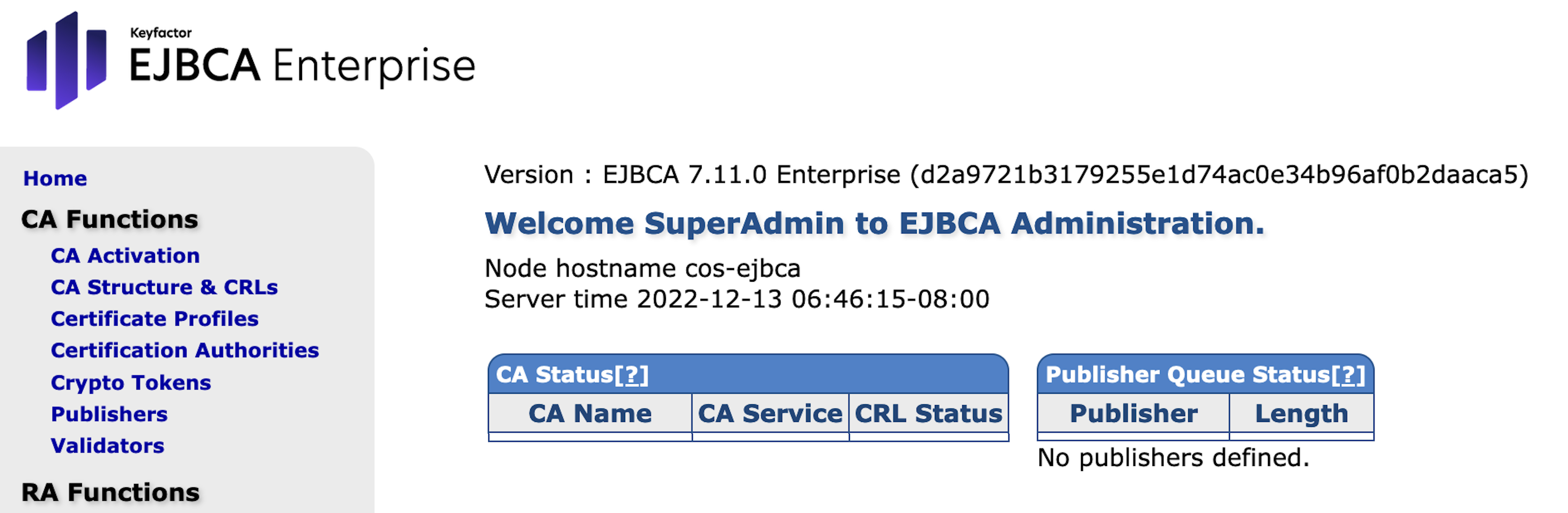 The EJBCA Administration page of the Hardware Appliance without ManagementCA looks as follows: