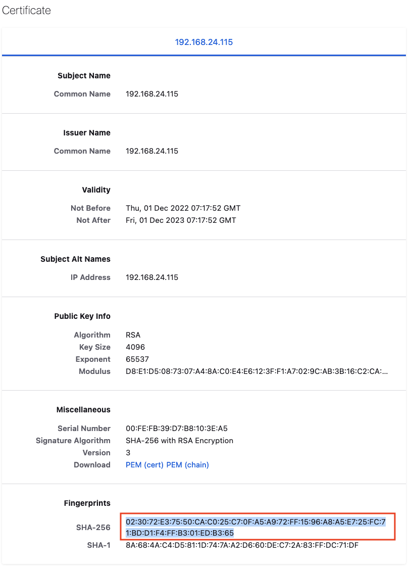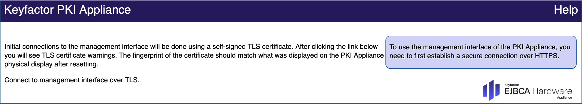 To establish the connection to the Hardware Appliance, you must verify the TLS certificate by confirming the TLS fingerprint. To do this, you need the TLS fingerprint as described in Step 2: One Time Password and TLS Fingerprint.