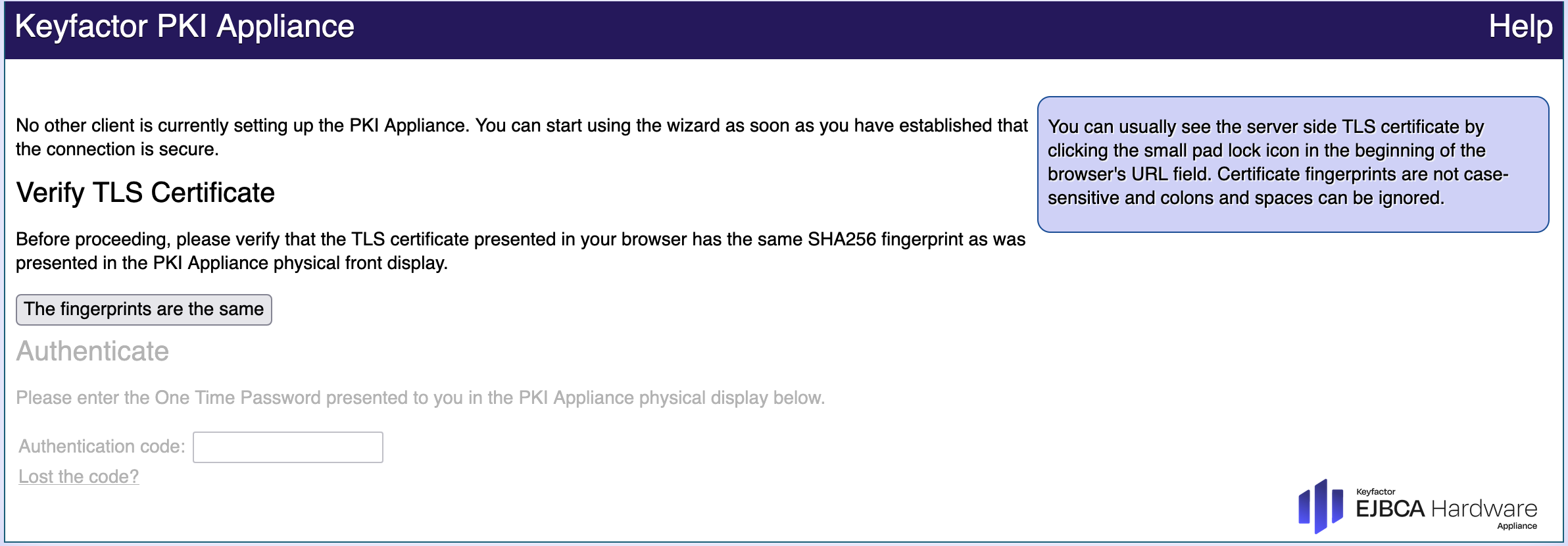 Click The fingerprints are the same in the Hardware Appliance certificate verification page (see Verify TLS Certificate). The Authenticate page will open and you can proceed with Step 5: Running WebConf Wizard.
