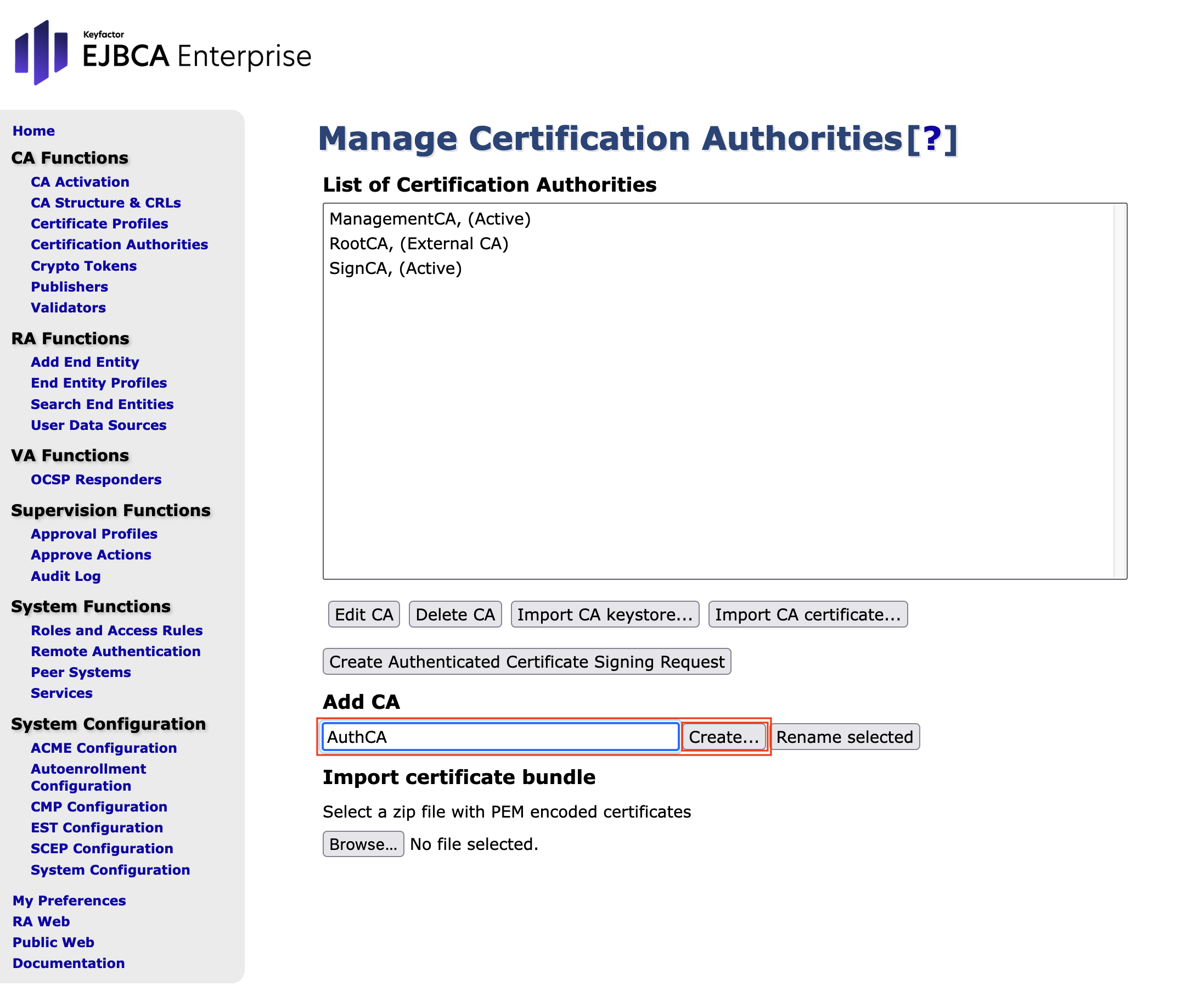 - In the EJBCA Hardware Appliance where AuthCA is installed (Node A), go to the sidebar, in the CA Functions section and select Certification Authorities.