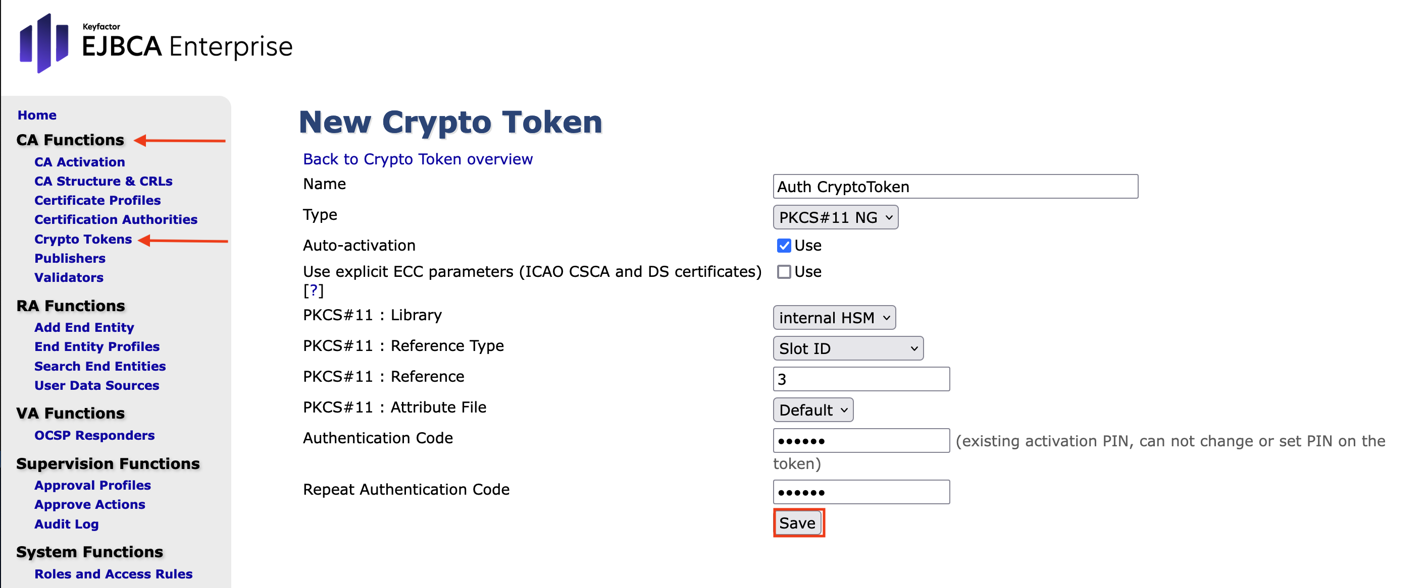 At this point, we will create a Crypto Token and generate public keys that will be used by AuthCA.